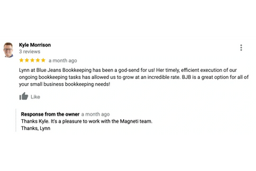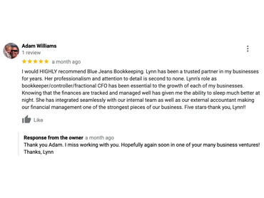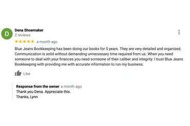 I have been working with Blue Jeans Booking now for 3 years and I will not use anyone else. Not only is Lynn (owner) fast she is professional, efficient and willing to work with me. In the 3 years we worked together I have yet to miss a deadline or have major errors in my books. It really feels like we are a team! So in effort of saving yourself so time and effort hire Blue Jean Booking for all your bookkeeping needs.